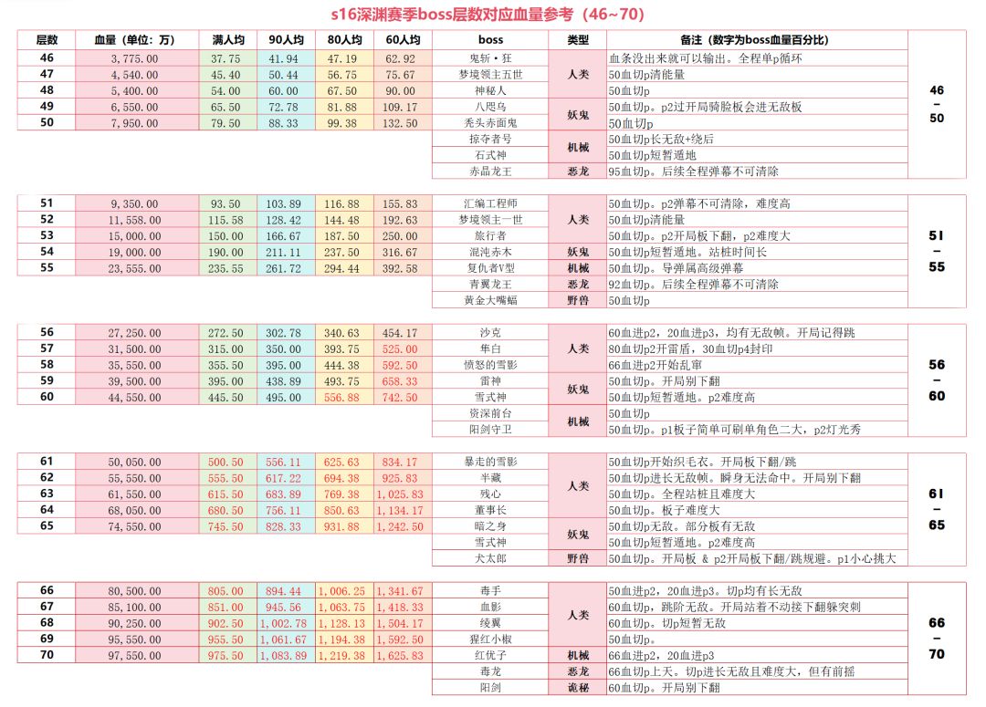 s16深渊赛季boss层数对应血量参考(46~70)