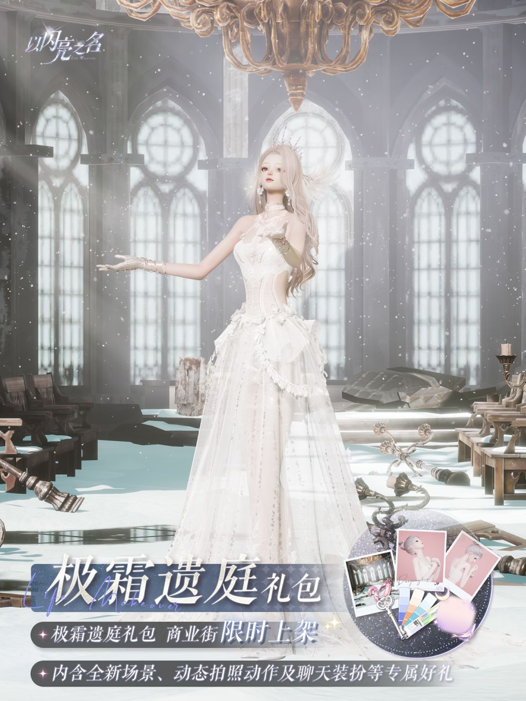 3.极霜遗庭复刻外观礼包:限时礼包售卖期间,合伙人可以4.6折的价格直接购买极霜遗庭外观礼包,内含摄像机镜头动态动作【初雪祈愿】、拍照场景【落霜祈廷】、拍照动作【霜风轻呓】、拍照运镜【初雪祈愿】、背景音乐【初雪祈愿】、聊天气泡【幻月游鲸】、潮流色卡*26和遇之钥*40,该礼包永久限购1次。