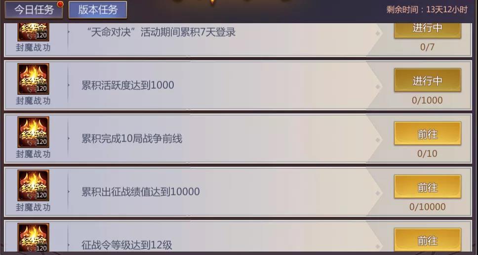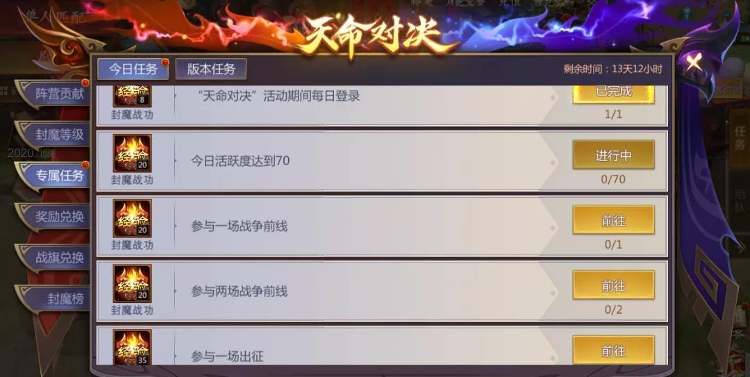 玩家可以通过完成专属任务或参加出征活动来获得封魔战功,以此提高自身的封魔等级,专属任务中包括今日任务和版本任务。