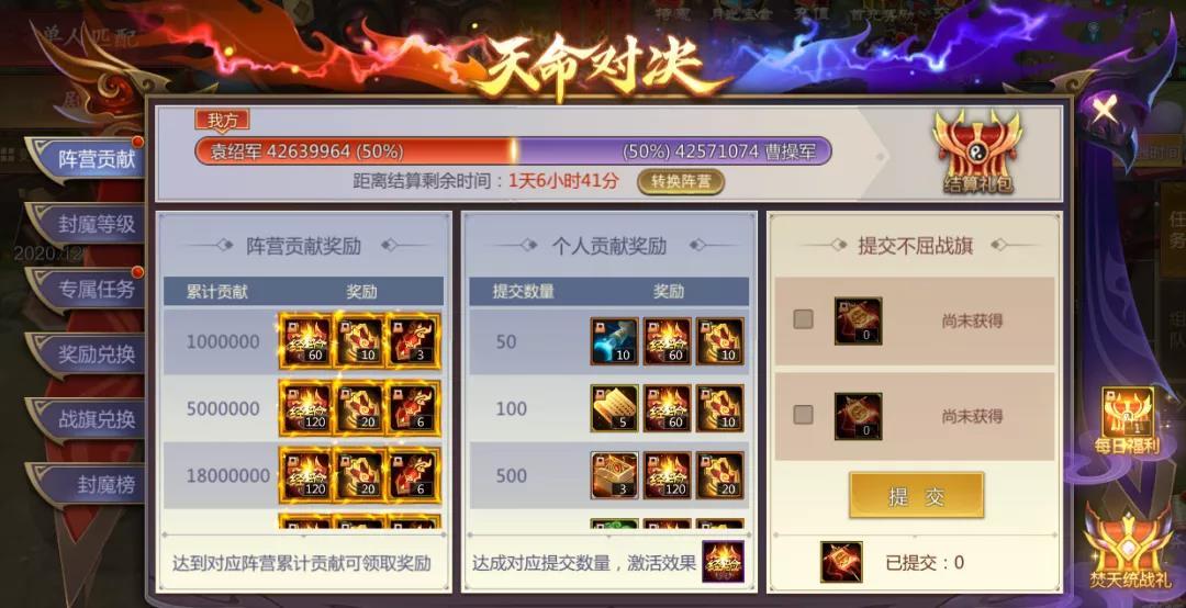 提交不屈战旗可提升自己与阵营的贡献值,达到指定数量可在“阵营贡献”界面领取个人贡献奖励和阵营贡献奖励。