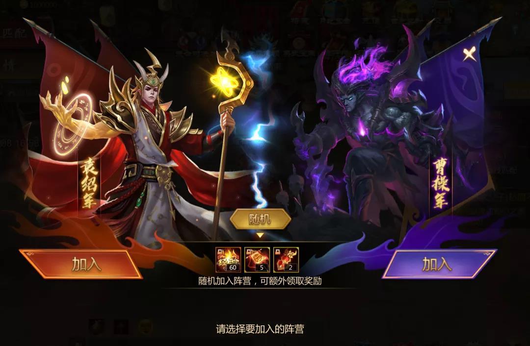 首先,活动开启后,玩家可以自主选择加入袁绍阵营或曹操阵营,当然,有选择困难症的小伙伴也可以选择随机加入,随机加入可以额外领取奖励哦。