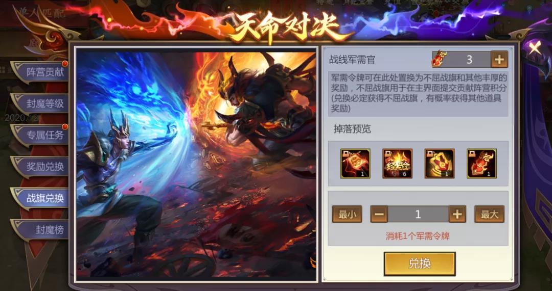 使用军需令牌可在战旗兑换界面兑换“不屈战旗”,同时有概率掉落其他封魔物品。