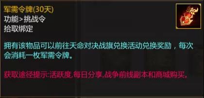 此外,还可以通过活跃度,每日分享,战争前线副本和商城来获得道具“军需令牌”。