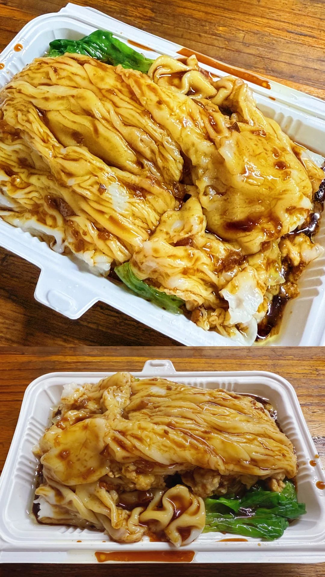 作为一个在龙岗老街 长大的人,还是很喜欢回到这边找吃的。这边老店也多,有种时间会在这边慢下来的感觉。 这次这家肠粉店也和老公过来吃了好几次了,他们家早上、晚上都会开,有次晚上也和老公专门来这边吃。 肠粉是浓油赤酱那挂、但调味刚好不会咸,吃得出葱头和冬菇的香味,粉皮偏糯微微一点韧,生菜倒是很爽脆新鲜这个点很加分(因为有的肠粉里的青菜会很老),皱皮肠粉很好挂汁,五六块一份性价比拉满