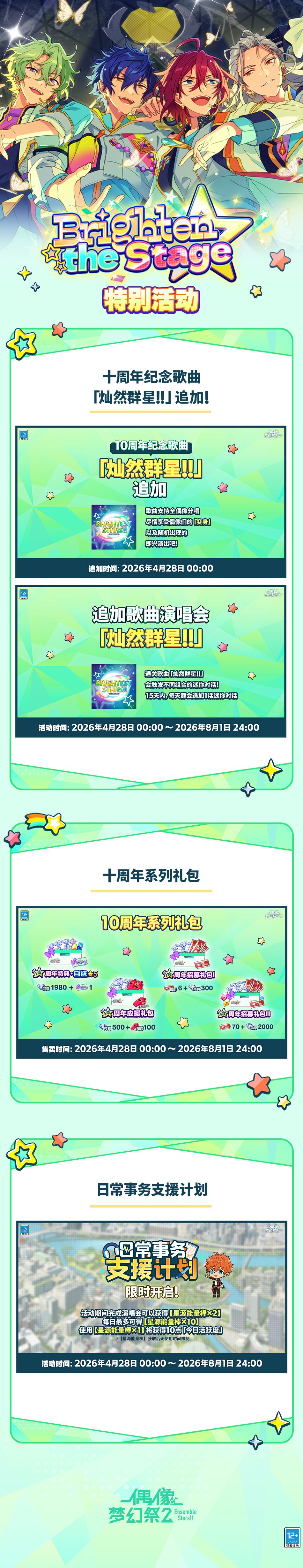 4月28日00:00~8月1日24:00期间通关「灿然群星!!」演唱会,可触发各个组合的迷你对话,迷你对话于15天内每天依次追加一话。