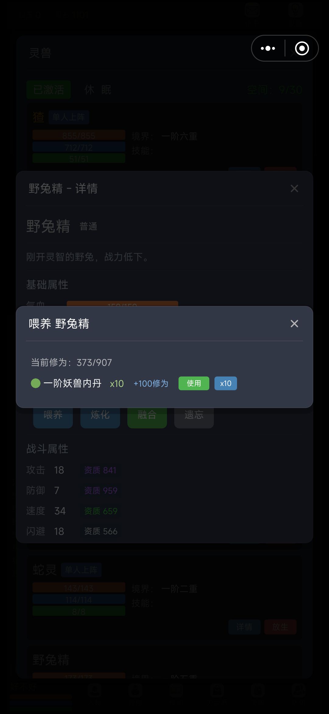 图1-4:宠物界面点击详情,有喂养/炼化(宠物消失变经验丹可喂养)/融合(概率把副宠技能合给主宠,副宠会消耗)/遗忘(使用遗忘药水随机忘掉一个技能,慎用)