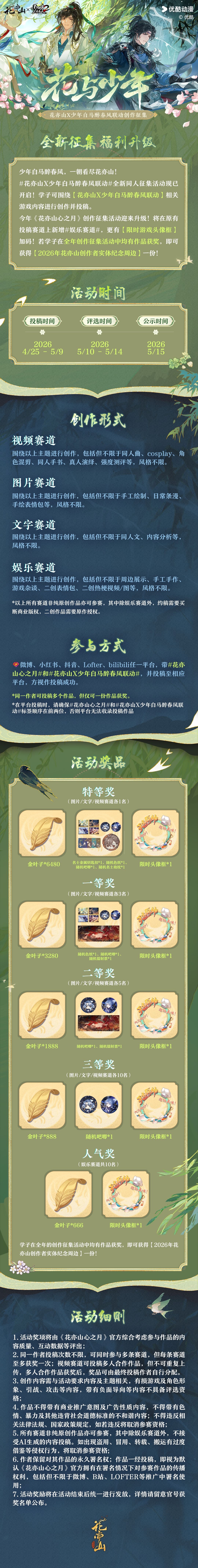 【花亦山X少年白马醉春风】联动创作征集活动开启,围绕《花亦山心之月》花与少年版本相关内容进行同人创作创作,并按照要求发布至对应平台,即视为参加活动。