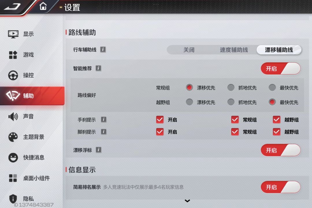 技巧1:新手阶段开启辅助线。路线辅助开启漂移辅助线,开启手刹提示,脚刹提示。他刹你也刹,让你轻松不迷路。