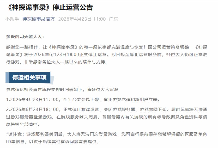 灵犀互娱旗下武侠悬疑探案手游《神探诡事录》官宣停运,官方发布公告,确定游戏将于今年6月23日正式停服下线,目前该作已全平台下架各大应用商店,落幕十分仓促。