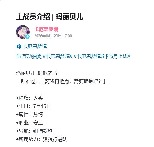 🛡️ 卡厄思梦境玛丽贝儿主战员曝光!热情守卫铜墙铁壁,5月上线自带反击体系