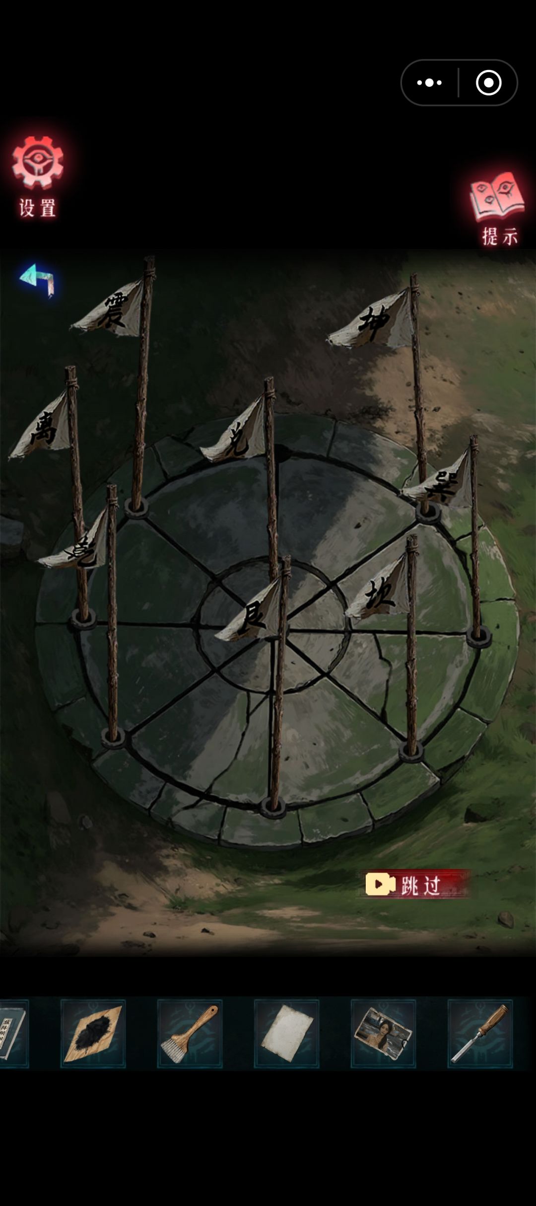 11。旗阵,把字旗放上去。然后按照古书的方法摆好。根据老爷爷的话,黑色部分是阴,有光的部分是阳,摆好先天旗阵(如图,把我图片没放上去的“兑”放到空位处就可以了)。获得拓包。