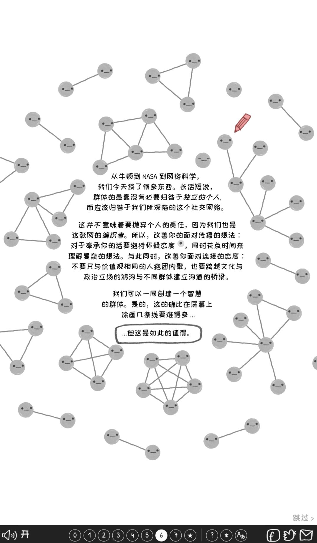 游戏通过一个个图形化的演示小游戏,展现出不同因素、架构下,信息是如何传递、影响到整体的判断。