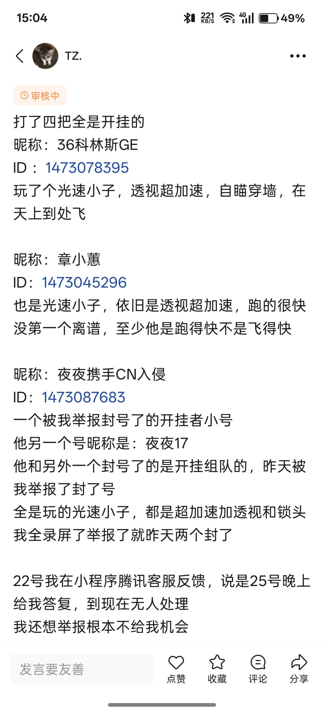 在QQ的高能英雄话题页面发帖子反馈开挂问题,不给我过审,微信腾讯客服小程序四天了没有人处理我的问题,我还有得举报呢完全不给我二次举报的机会。游戏里面举报根本不管的,我都录屏了无人在意啊