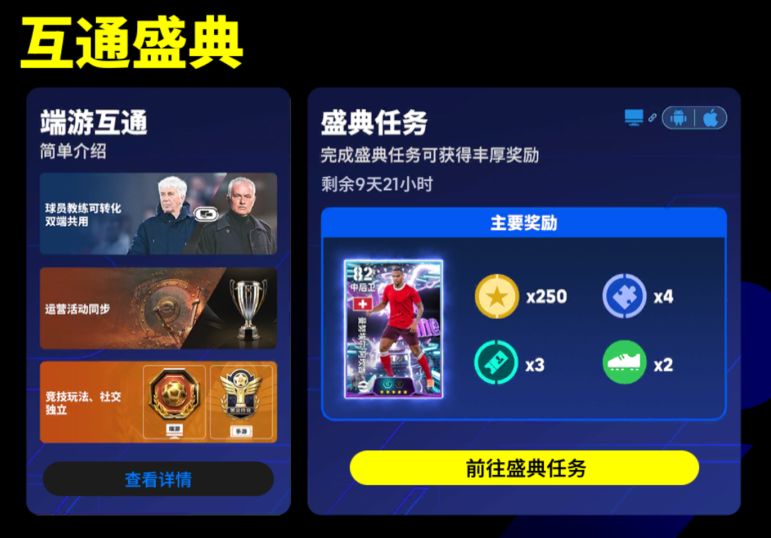 双增能史诗高光鲁梅尼格、马特乌斯将通过【双端齐聚 狂欢赠礼】首次登场!除此之外,你还将有机会获得双增能史诗高光德塞利、贝克汉姆、伊涅斯塔、卡福、卡恩、托雷斯。想要补强球队的玩家们,千万不要错过此次活动!