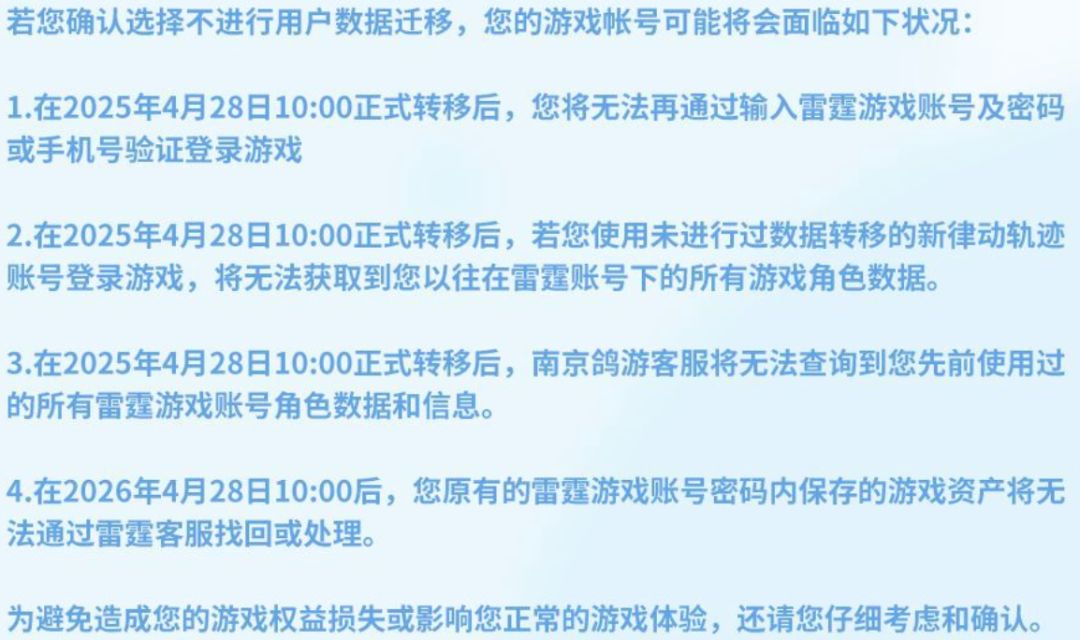 2025年4月28日之前注册雷霆游戏账号的小鸽子们,还没转移账号数据的请抓紧转移!