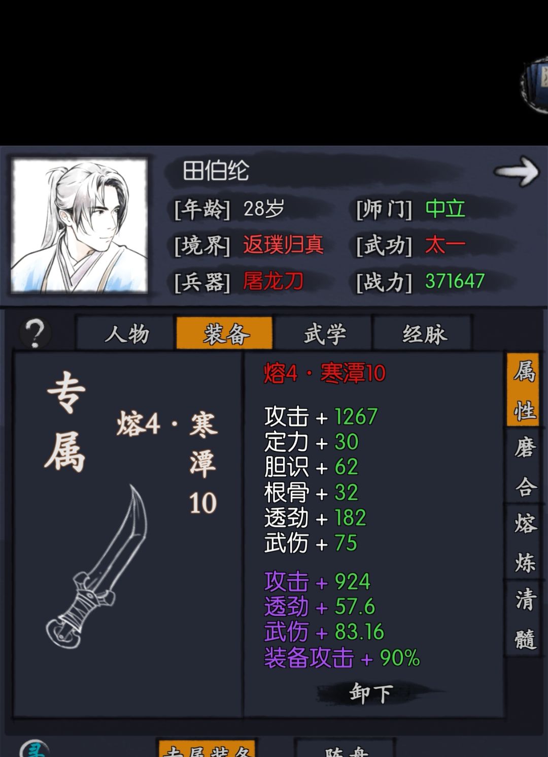 1.属性:典型武伤侠客,核心属性是武伤,透,攻击,然后就是速度,最后血量和暴击。速度好理解,武伤侠客靠先出手,暴击是因为田暴击会加攻击buff,血量用来抗伤。一般来说,田第一刀必秒人,秒不了别人大概率就是等死了。