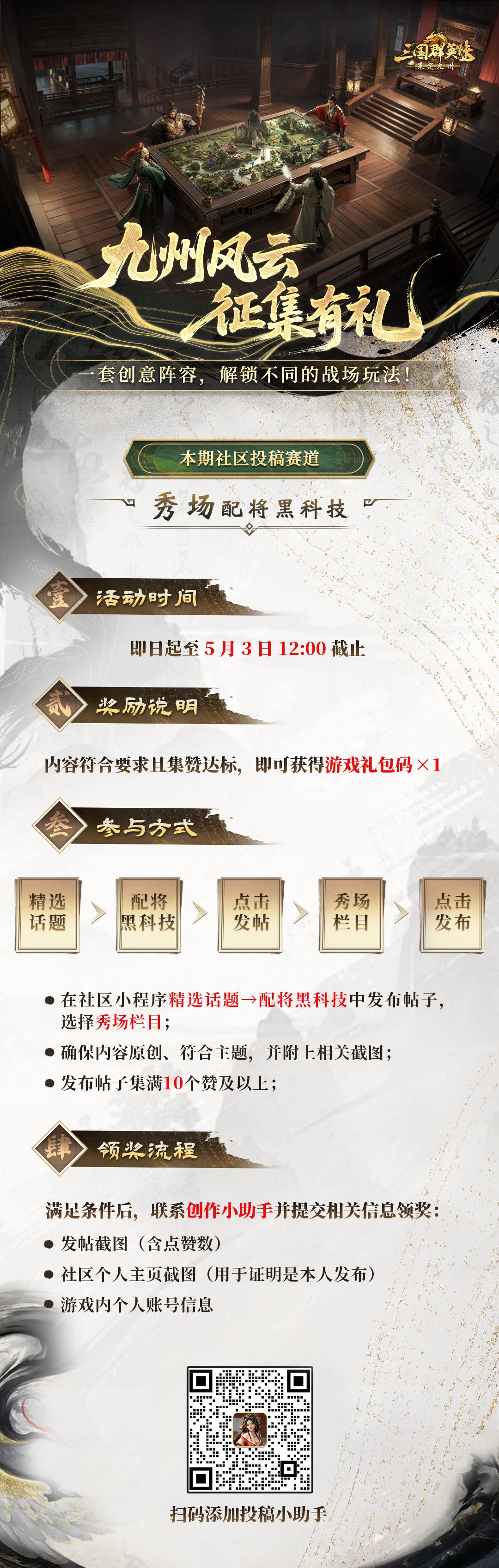 每一套冷门组合、每一种趣味玩法、每一队小众黑科技搭配,打破常规战局,也都值得被记录!九州玩家创意阵容征集活动,秀出主公的独特思路!