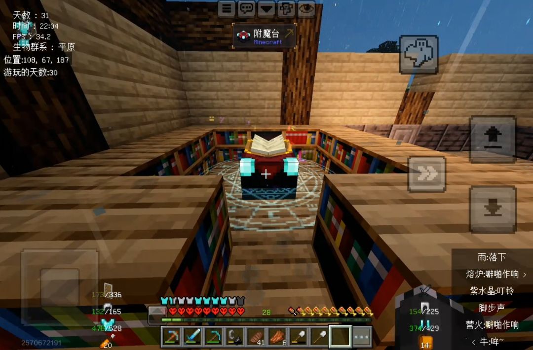 目前已经给基地造好了, 30级附魔台也有了,就是没有时运3的镐子我附到的是精准采集,所以下了一下矿挖了点矿回来,等有了时运再一口气挖了,这期间有两次差点被女巫阴死,就是那种女巫混在一群怪,然后直接扔个毒药,剩半颗心,反正就是差点就死了,现在准备给装备提升一下,然后去下界