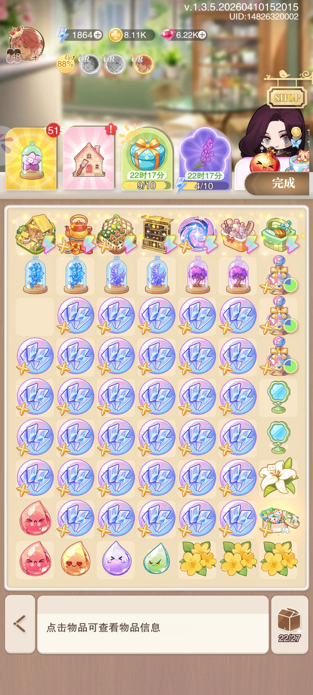 ①.联珠奇谭——拉爆了。前面需要提交的都还好,最后一盘那个满级镜子恶心死我了,化妆品提取器镜子爆率本来就低,我满级化妆品的好几个了镜子都抽不到,后面还是用大升级卡做完的任务,体力不多的不建议肝满这个任务,只有一张五星,消耗体力还多,拉爆了。