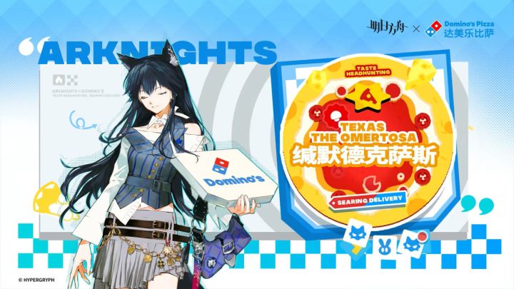 4月25日,在《明日方舟》七周年庆典特别直播的尾声,鹰角网络正式官宣了与全球知名披萨品牌达美乐的联动合作,联动宣传PV同步公布,主题定为美味寻访,炙讯速达,联动核心为两款主题套餐,将于5月1日正式在全国上线