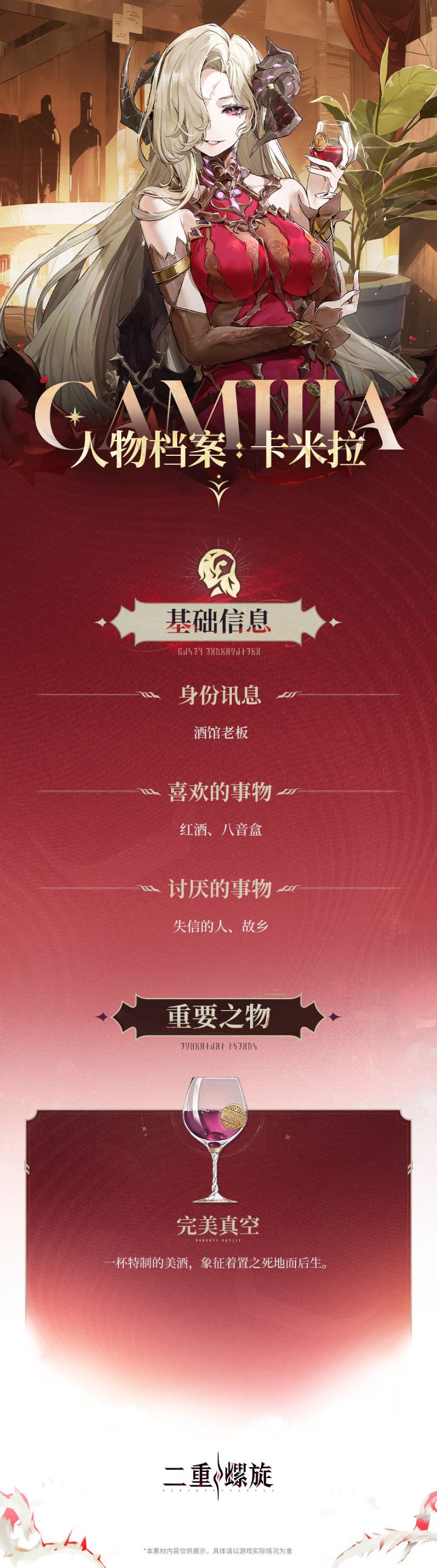 4月25日,《二重螺旋》官方分两弹正式公布了全新角色 「卡米拉·赤影佳酿」 的完整情报,包括高清立绘、动态展示、技能机制及获取方式,这位神秘的水仙平原酒馆老板,将以火属性副C的定位于5月5日10:00正式加入游戏![[TapTap表情|TapFamilyxdoro2_粉狗比心]](https://img-tc.tapimg.com/market/images/101c7e3200596fe8e03765080b467fb8.gif)