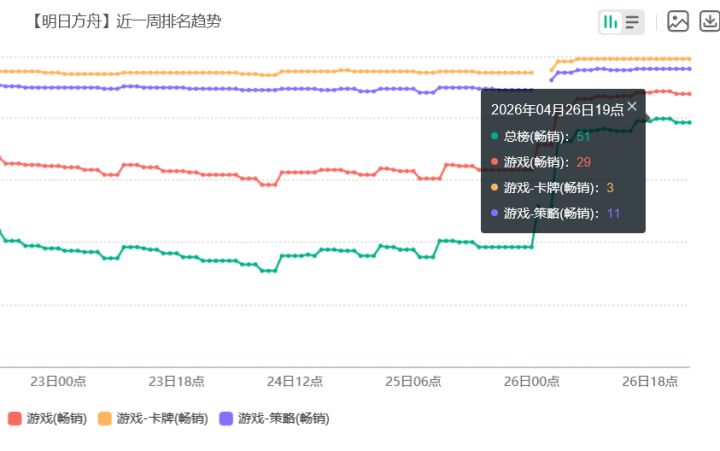 根据第三方平台七麦数据显示,截至4月26日,游戏在苹果总榜畅销榜排名升至第51名,游戏畅销榜排名升至第29名次,卡牌分类榜第3名次,策略分类榜第11名次,较此前低迷期显著回暖。
