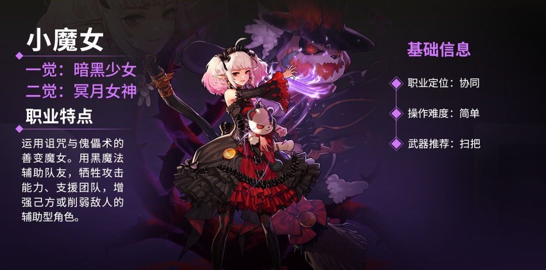 小魔女是魔法纯辅助职业,具备免死、增伤、护盾、回血能力。定位偏向团队增益与生存保障,区别于传统奶爸奶妈的辅助模式,技能自带暗属性攻击,是当前版本唯一能兼顾生存保护与伤害提升的全能辅助。增伤效果与暗强直接挂钩。