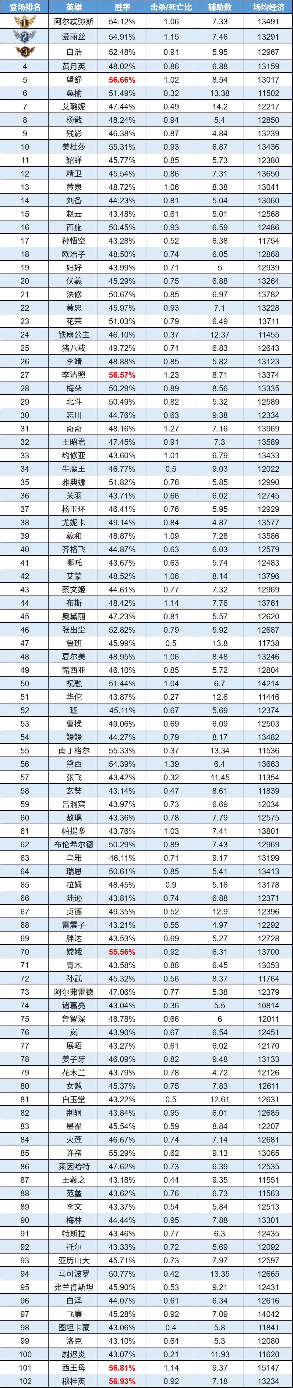 【低段位】穆桂英依旧强势占据胜率榜榜首,嫦娥进入TOP5。榜首再度易主,西王母凭借惊人的发育能力登顶场均经济第一。