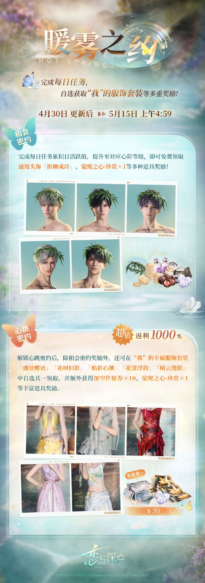 ✨解锁心跳密约后,还可在本次更新后商城上架的5套“我”的服饰套装中立即自选一套领取,并额外获得「深空许愿券*10」、「觉醒之心·珍贵*1」等丰富道具奖励!