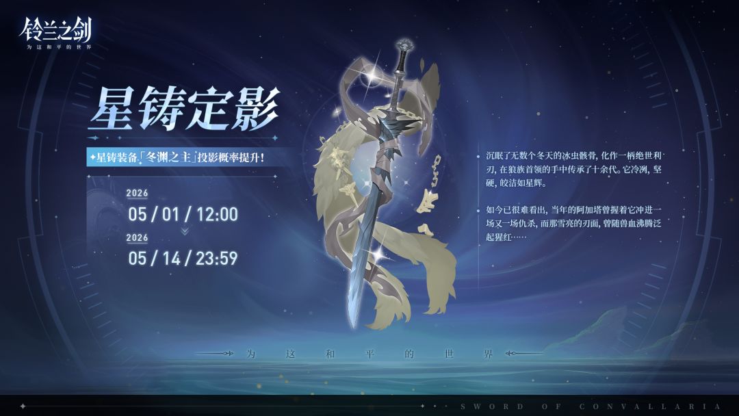 「星铸定影」限时投影将于 2026/05/01 12:00 - 2026/05/14 23:59 开启,全新星铸装备「冬渊之主」投影获取概率将大幅提升!