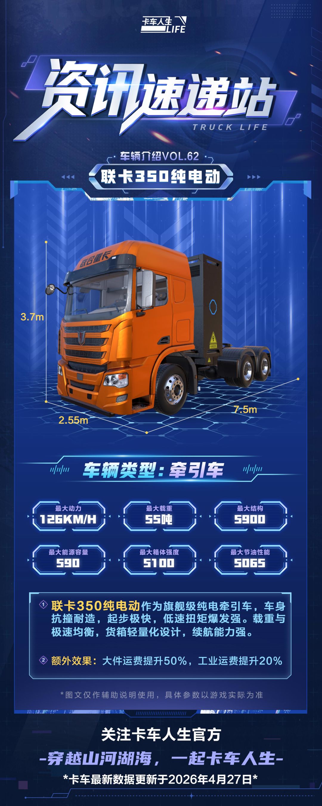 《卡车人生》4月27日牵引车「联卡350纯电动」加成调整公告