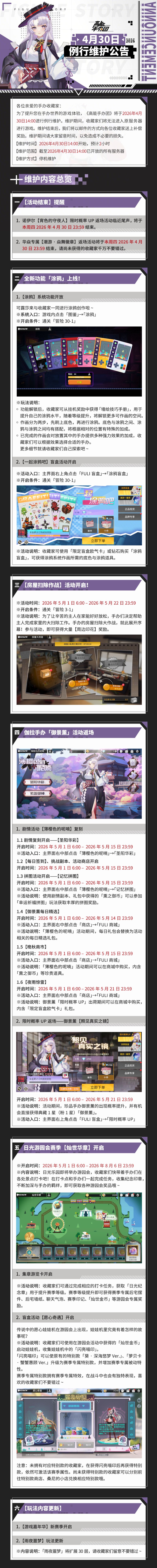 为了提升您在手办世界中的游戏体验,《高能手办团》将于2026年4月30日进行例行维护。详细公告内容请点击下方图片查看: