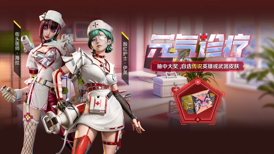 重点道具:海拉史诗级皮肤【街头医师】、伊芙史诗级皮肤【殷红护士】、传说级武器皮肤R117-【突击急救】、追踪者-【追踪治疗】。