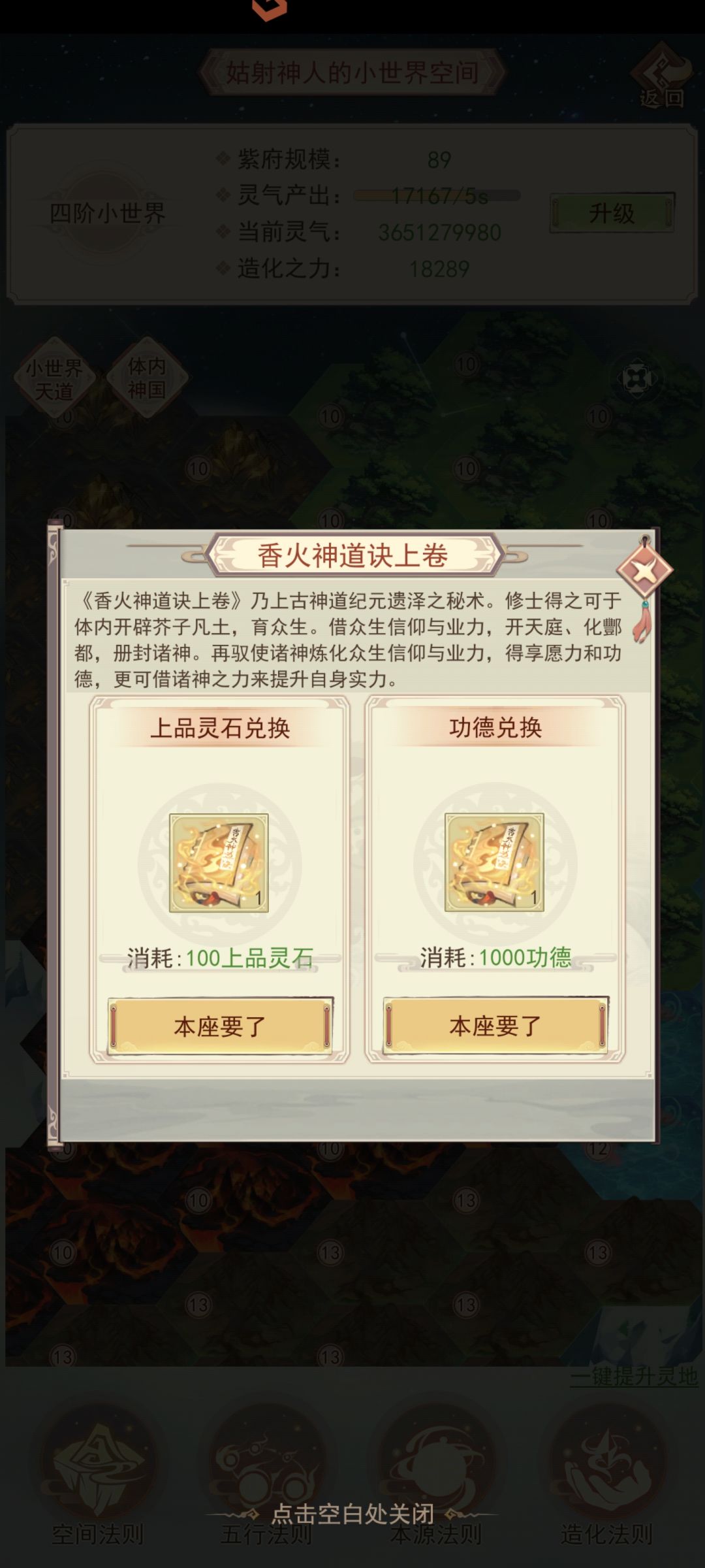 小世界板块点击体内神国花费100上灵或者1000功德兑换习得《香火神道诀上卷》