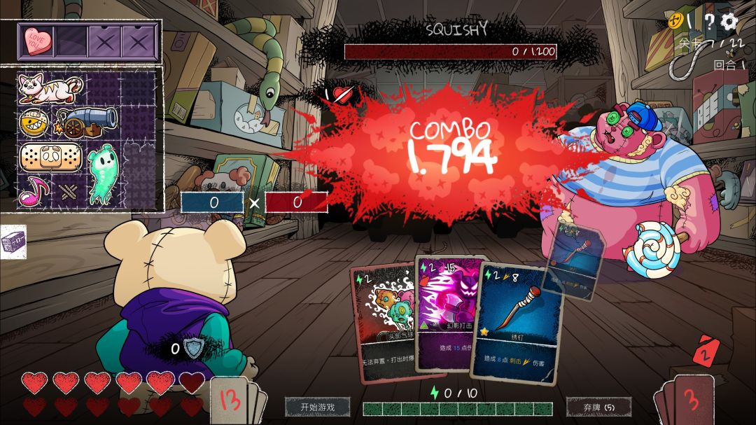 在战斗中共有10点基础能量,出牌时不单单要考虑能量,还要考虑出牌的顺序、有些功能牌,例如恢复血量的“健康玩偶”需要在打出牌的正中间,意味着想回血本回合只能打出基数牌,偶数则卡牌白打。