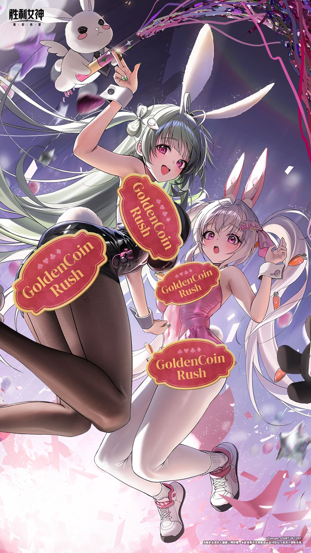 「GOLDEN COIN RUSH 金币大作战」活动即将开启,兔女郎索达和爱丽丝为指挥官准备了幸运祝福,特此献上「招募券×10」作为礼物,请指挥官于4月29日活动上线后在邮箱中查收!