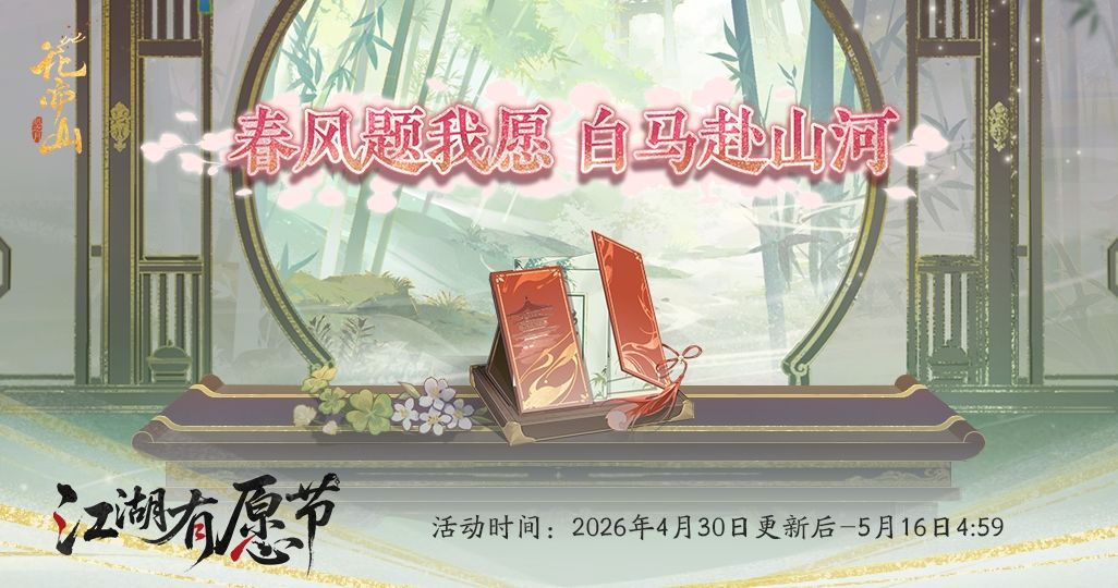 参与方式:活动期间,在【江湖有愿节】中完成【愿望匣】活动,即可获得花诏令(限时)奖励!完成许愿累计可获得花诏令(限时)*20!