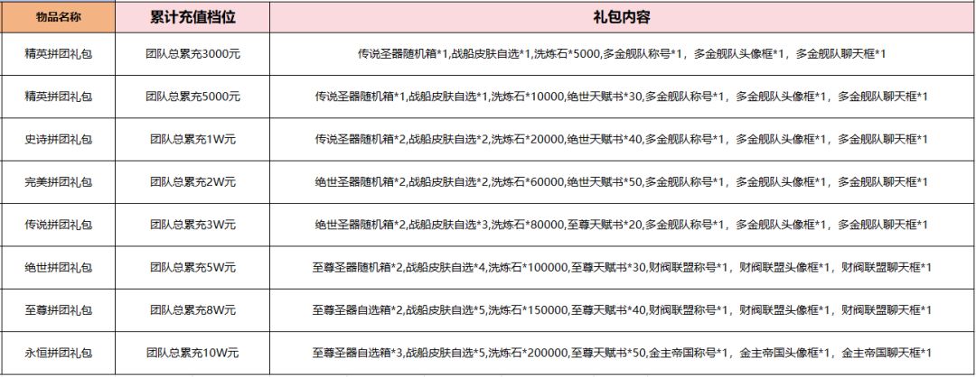 活动时间内,玩家自行组团,团队总计累充达到指定金额每人可领取一份累充奖励。