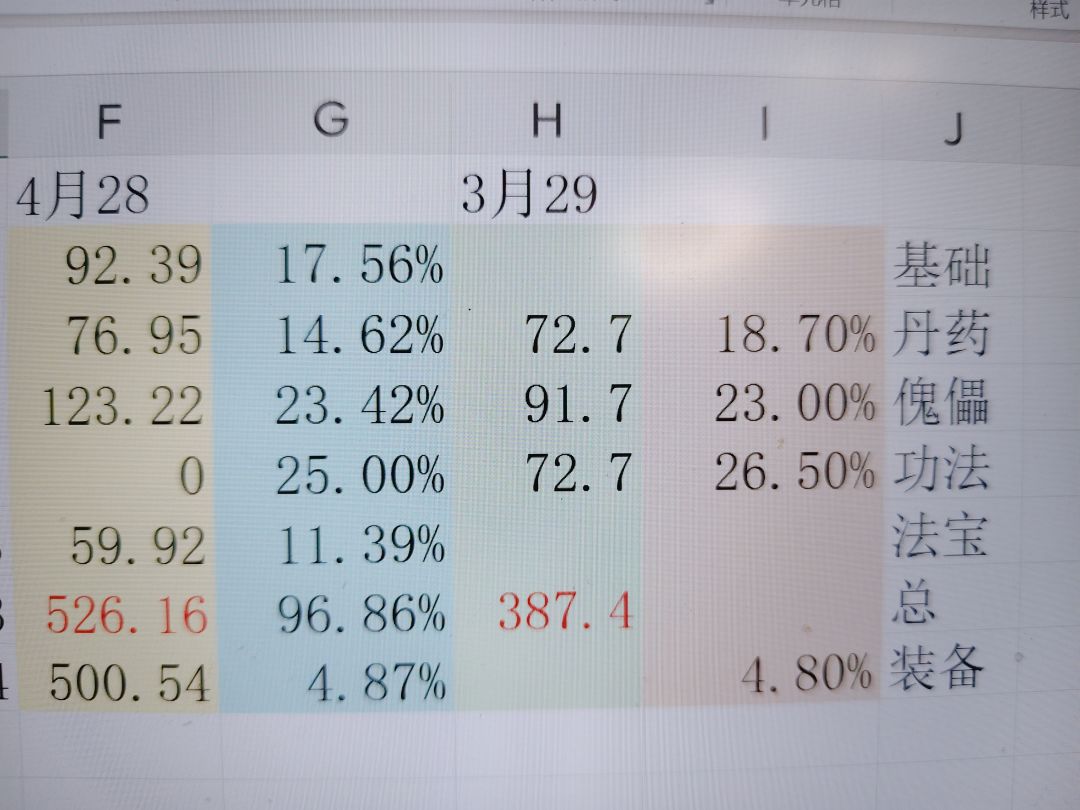 总结:该版本四维属性上调,可以看出丹药比例下降(白玉京未升级):傀儡优化;装备略微提升?(可能是全红导致的)