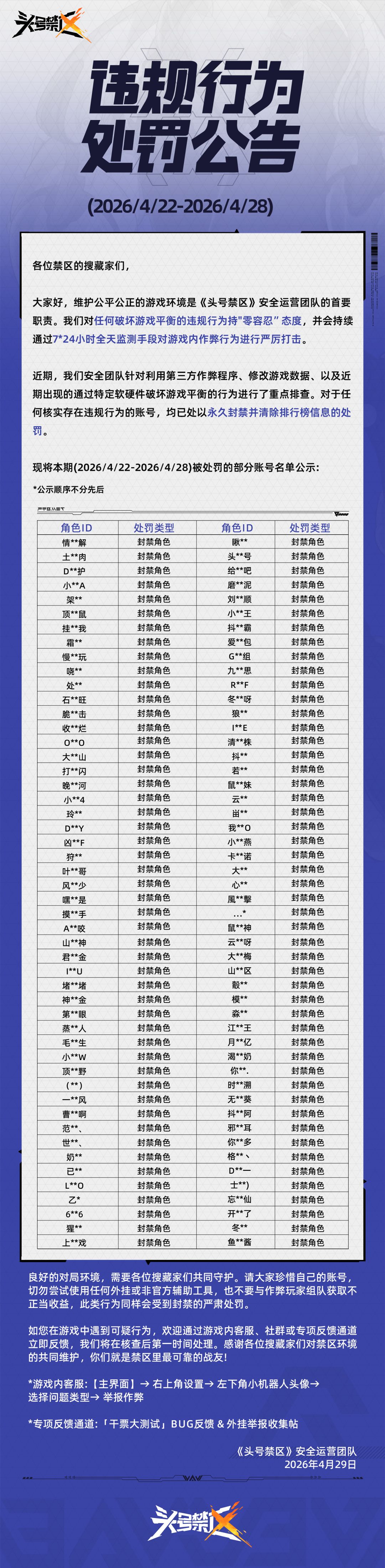 《头号禁区》外挂作弊处罚公告(4月29日)