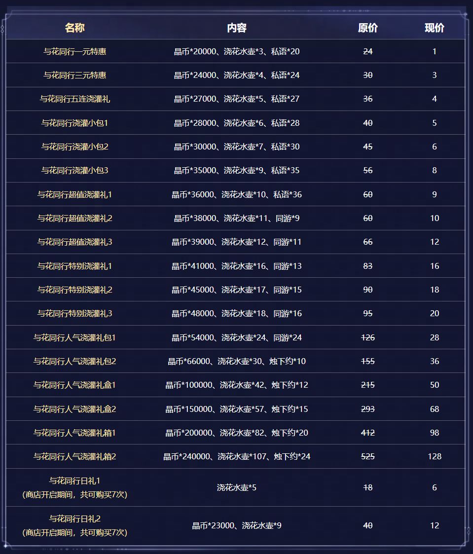 1. 【与花同行】辰星侧影将于4月29日更新后~5月6日03:59期间限时开放获取。使用【浇花水壶】进行浇灌,有机会解锁辰星侧影、金色藏品、藏品培养道具、体力兑换道具等奖励。