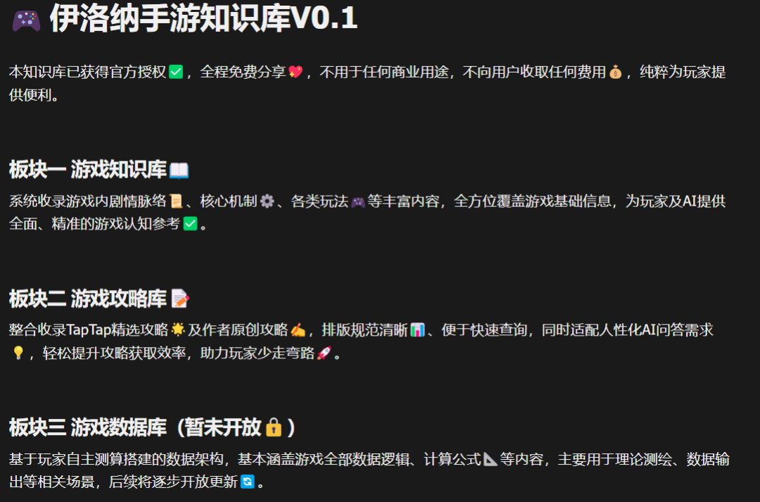 受数据获取难度、数据噪声等方面影响、以及各攻略作者术语差异,筛选与清洗数据工程量颇大,以及为了后续AI检索方便要结构化知识库、设置关键词等。目前仅有笔者一人完成,故仅提供基础架构,如不能满意还请留下宝贵意见。