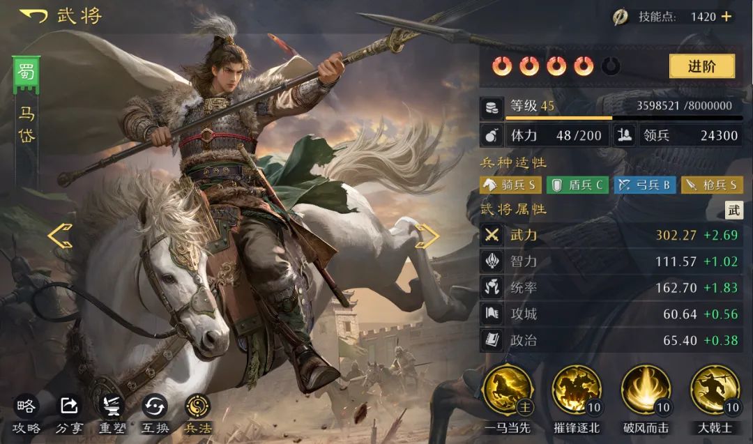 因此,马岱使用时需要注意队友加点,确保负责触发逐北的武将为队内武力最高;整体定位更偏副C兼辅助补伤。
