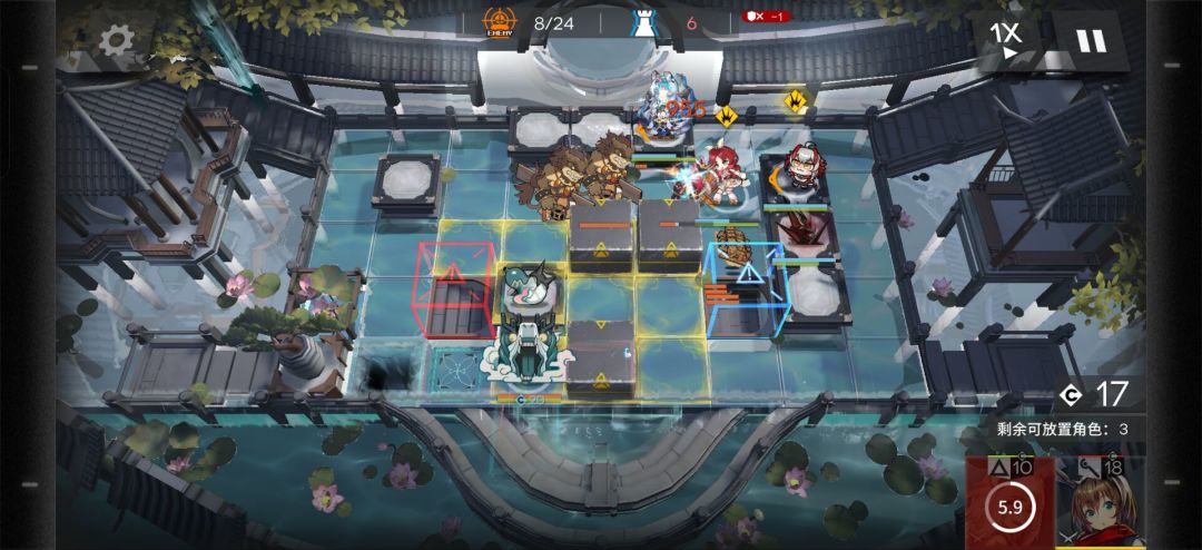 打到这关避无可避,因为前面有我想要的关卡,指点迷津,所以硬着头皮也得打。结果人物太少,费用回不上来,又要下障碍物,一个5费,又要下干员,精1圣聆初雪2技能暖机太慢了,带1技能好了,