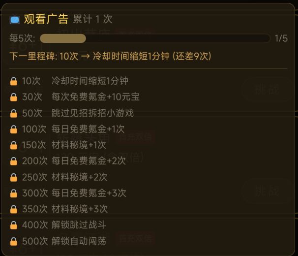 (2)联动游戏中,江湖声望达5级,可解锁本游戏广告特权200次档特权,江湖声望达10级,可解锁广告特权500次档特权