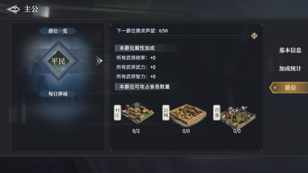 爵位等级提升会增加玩家可占领的村庄和县城。