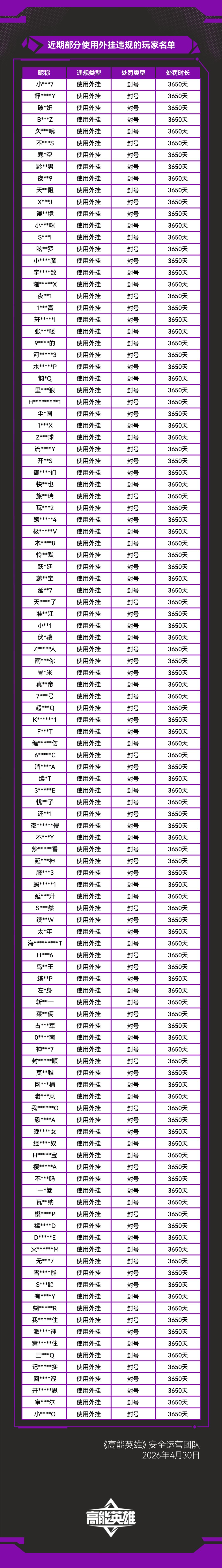 《高能英雄》外挂作弊处罚公告(4月30日)
