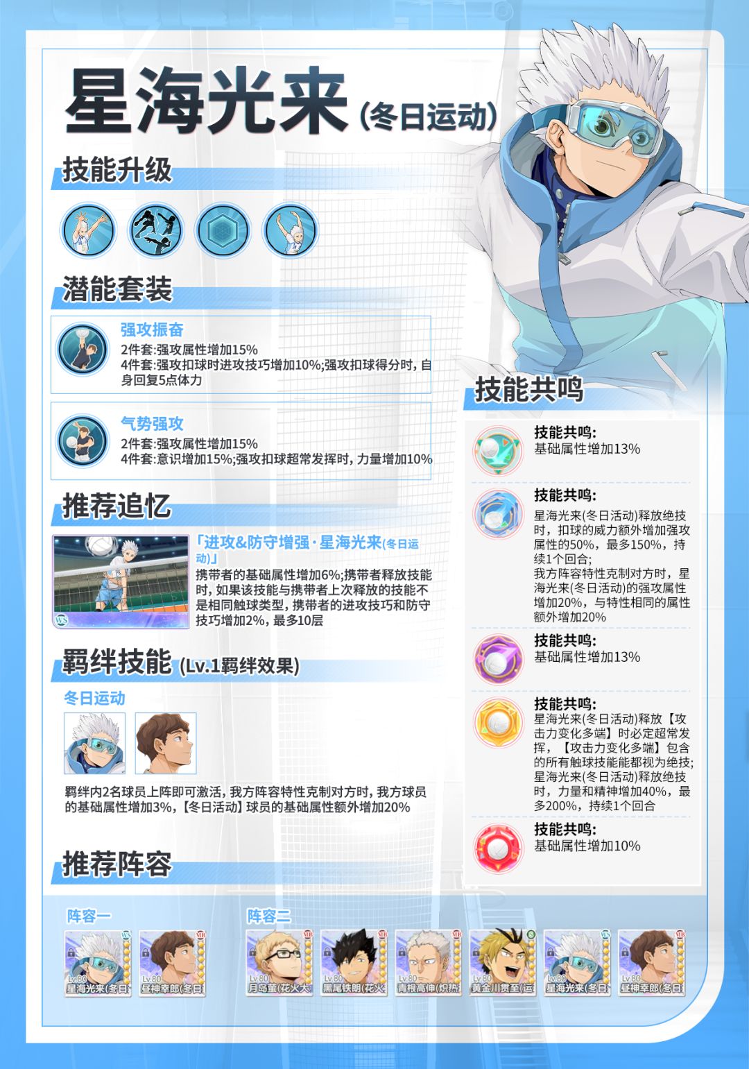 ❄️ 下面带你一张图了解「星海光来-冬日运动(WS)」适合的潜能套装、适配的追忆、技能共鸣介绍、角色独特羁绊、优质阵容组合!