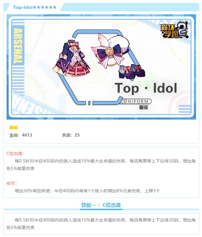 每半秒一次400码大范围的AOE伤害,在480级时装备Top·Idol(0亲密度0追加)时约为7600的血量,也就是大约保底每半秒760点能量伤害,可以通过提升生命值上限等方式提升伤害。