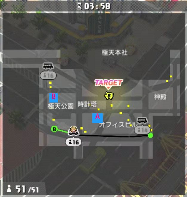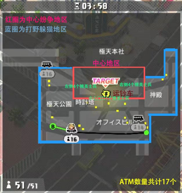 b.蓝圈为打野躲猫地区:巴士开始所有的下车点都是在该区域内,区域特点就是,遍布ATM机(目前共计有17个,一个ATM机子有5W),每个人下巴士的时候身上都有点钱(每人固定是1W)